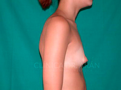 Aumento de mamas. Prótesis de mama de 400 cc., redondas, texturadas, perfil alto, implantadas por via areolar y colocadas a nivel subglandular. Post-operatorio a los 6 meses.