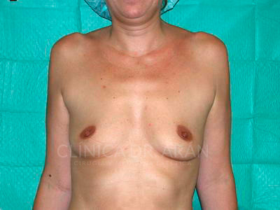 Aumento de mamas. Prótesis de mama de 240 cc., redondas, texturadas, perfil alto, implantadas por via areolar y colocadas a nivel submuscular. Post-operatorio a los 6 meses