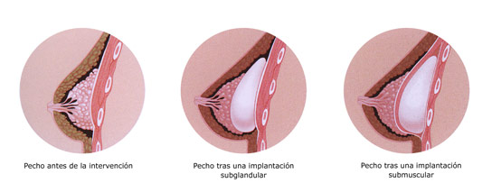 El aumento de las mamas se consigue introduciendo una prótesis o implante de mama, ya sea detrás del tejido mamario (subglandulares), debajo del músculo pectoral (submusculares), o debajo de la fascia del músculo pectoral (subfasciales).