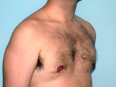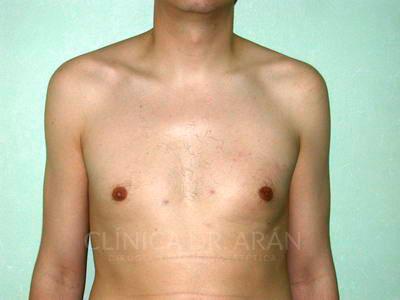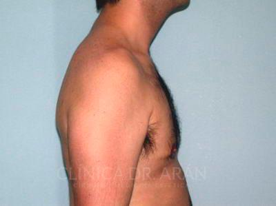 Ginecomastia Hombre con moderado exceso de crecimiento mamario. Se practicó liposucción y exéresis parcial de tejido glandular (mastectomia subcutánea) y reducción de areolas.